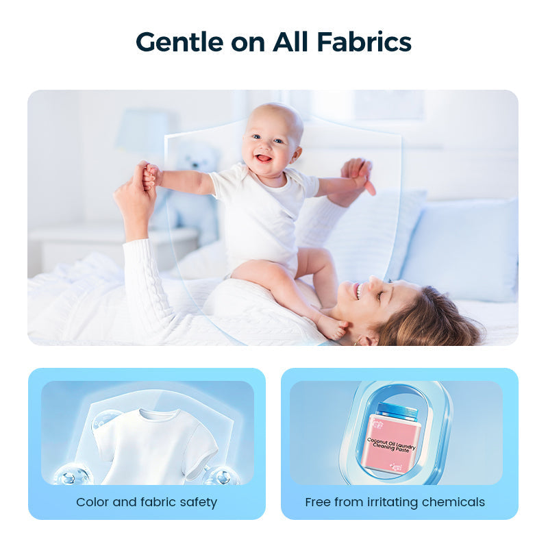 KÖNYNYŰ A SZÖVETEKHEZ - Kókuszolajjal készült, hatékonyan tisztít anélkül, hogy károsítaná a finom szálakat. Biztonságos számos anyaghoz, beleértve a babaruhákat, törölközőket és más érzékeny textíliákat.