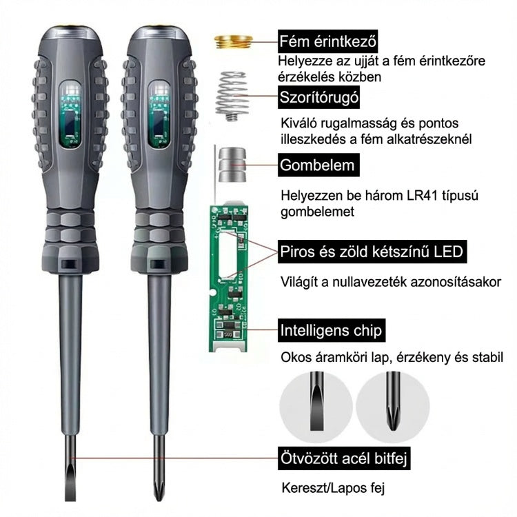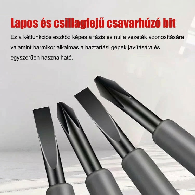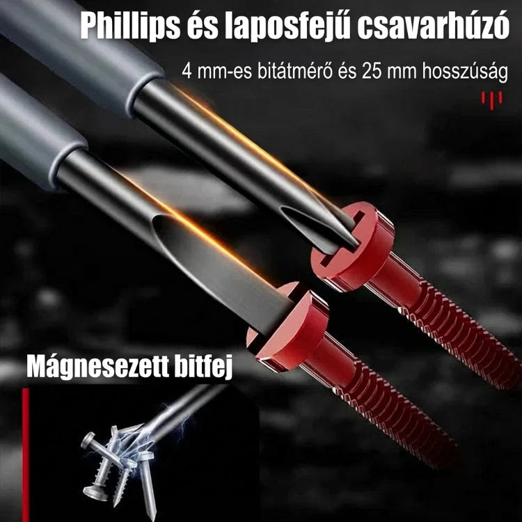 ⚡【Mágneses csavarhúzófej】- Két specifikáció: egyenes és kereszt csavarhúzó, erős mágneses kialakítással a fején, amely képes felszívni a csavarokat és a kis fém alkatrészeket, javítva a munka hatékonyságát,