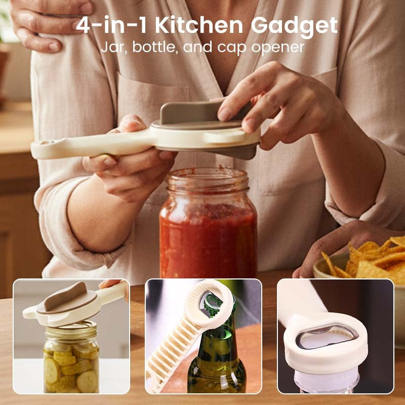 4-IN-1 TÖBBFUNKCIÓS ESZKÖZ: Négy alapvető konyhai eszközt egyesít egy kompakt eszközben, beleértve egy üvegnyitót, egy palacknyitót és két csavaros kupaknyitót, így értékes helyet takarít meg a fiókban és egyszerűsíti a konyhai feladatokat.