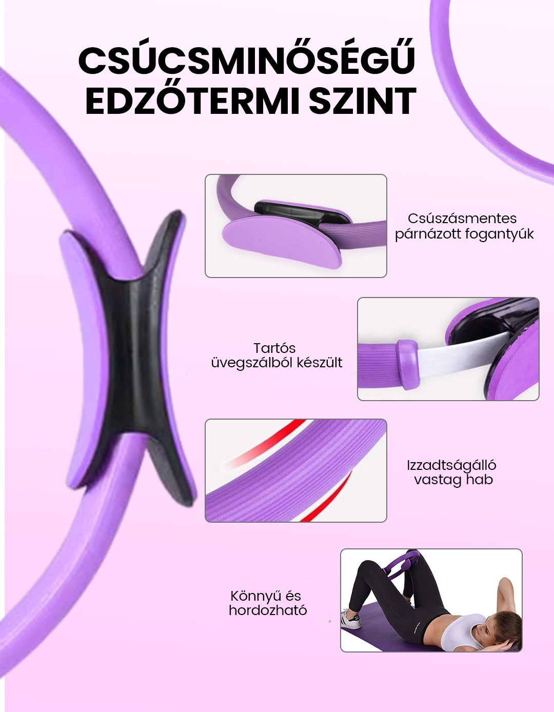 Teljes testet megmozgatĂł gyakorlat- Az oldalsĂł, Ăvelt fogantyĂșk lehetĆvĂ© teszik, hogy a tĂ©rd között, a belsĆ Ă©s kĂŒlsĆ combgyakorlatokhoz, vagy egyik boka alatt is könnyedĂ©n tartsd a gyƱrƱt, miközben a lĂĄbad lenyomja a padlĂł felĂ©, akĂĄr lĂĄb-, akĂĄr core gyakorlatok vĂ©gzĂ©se közben.